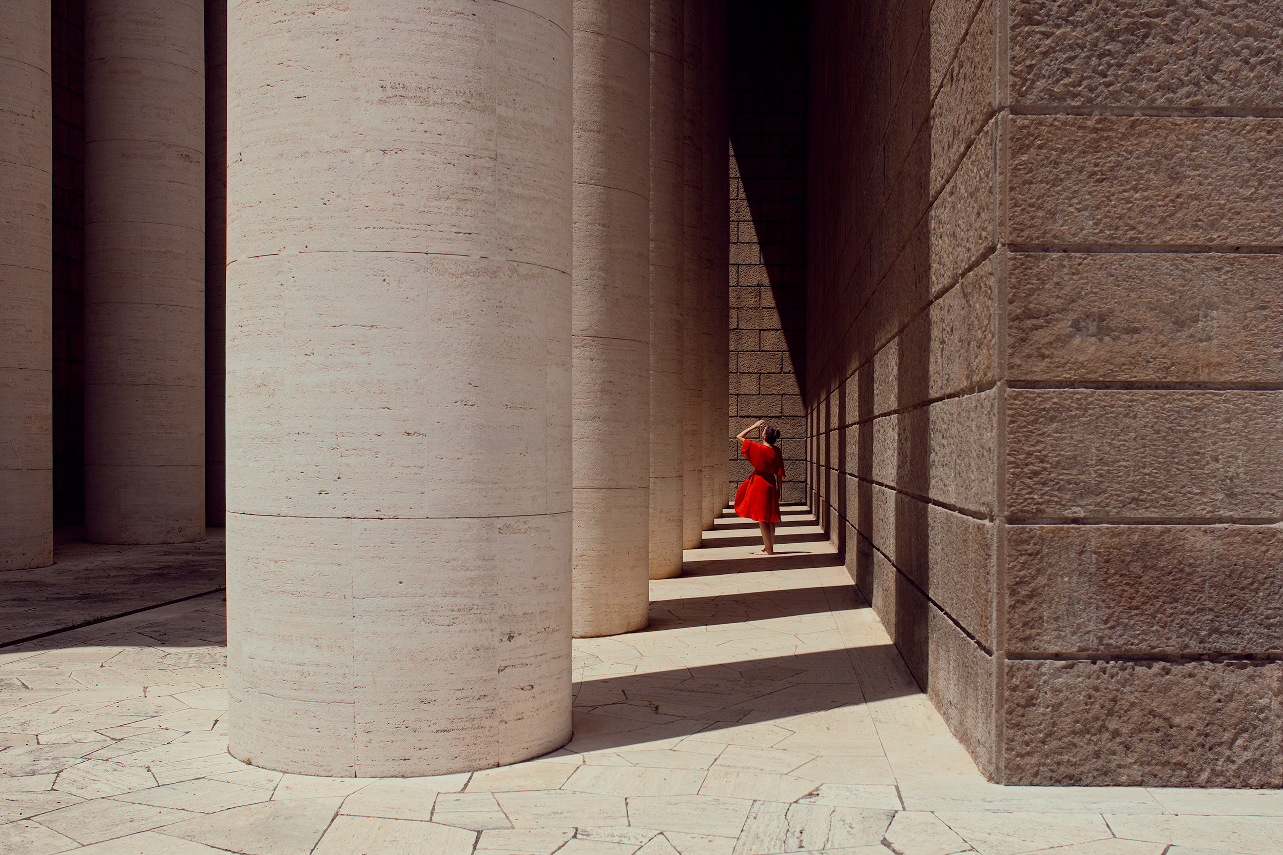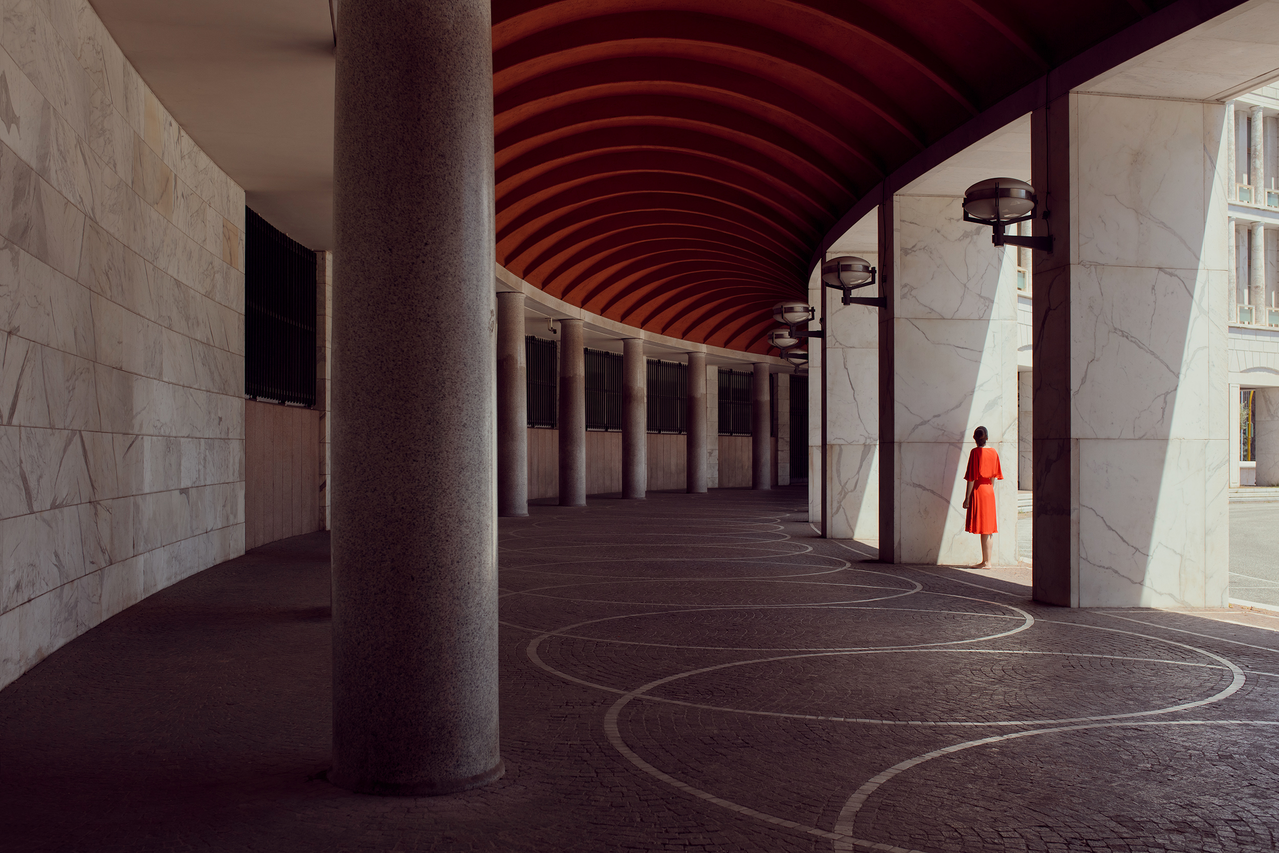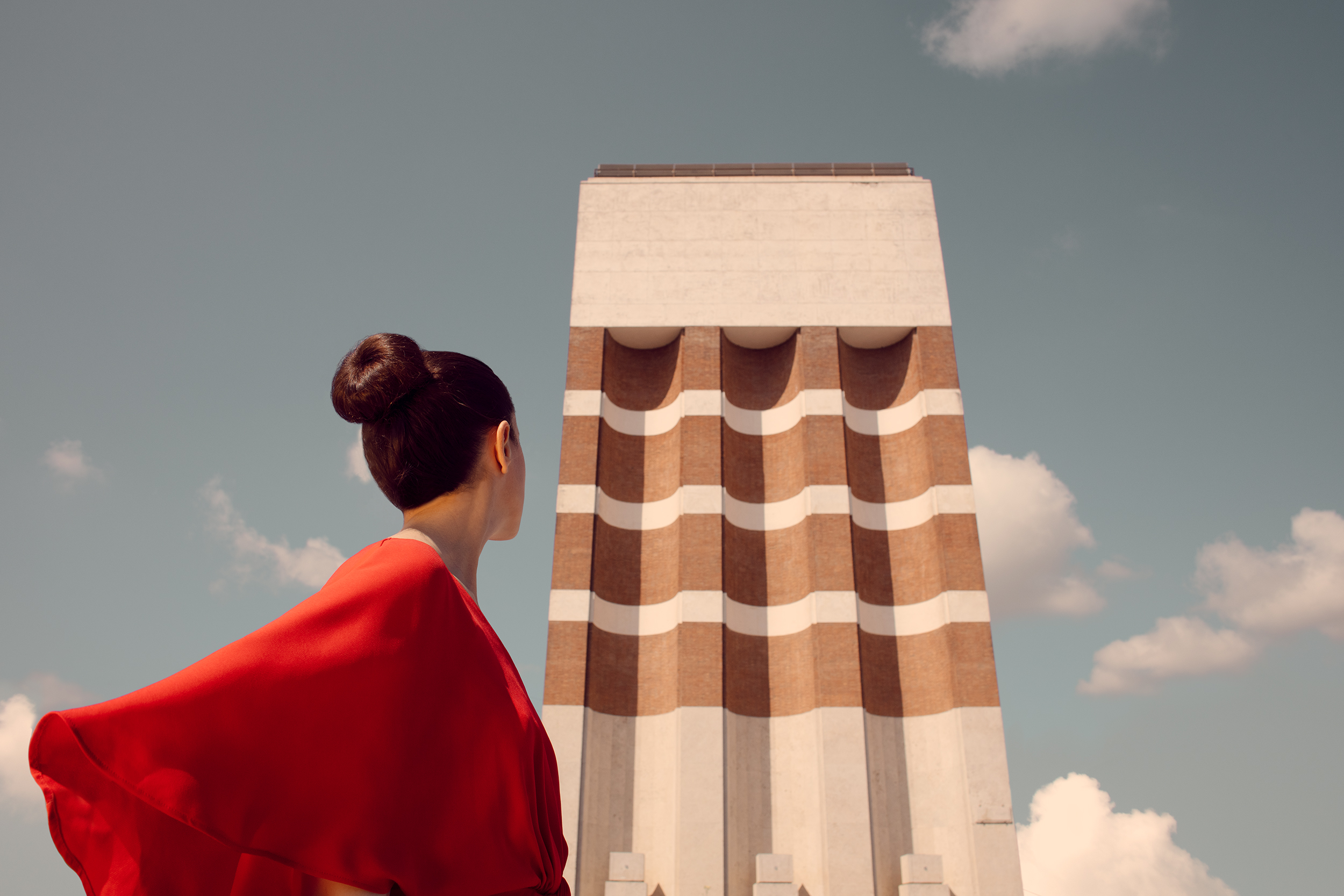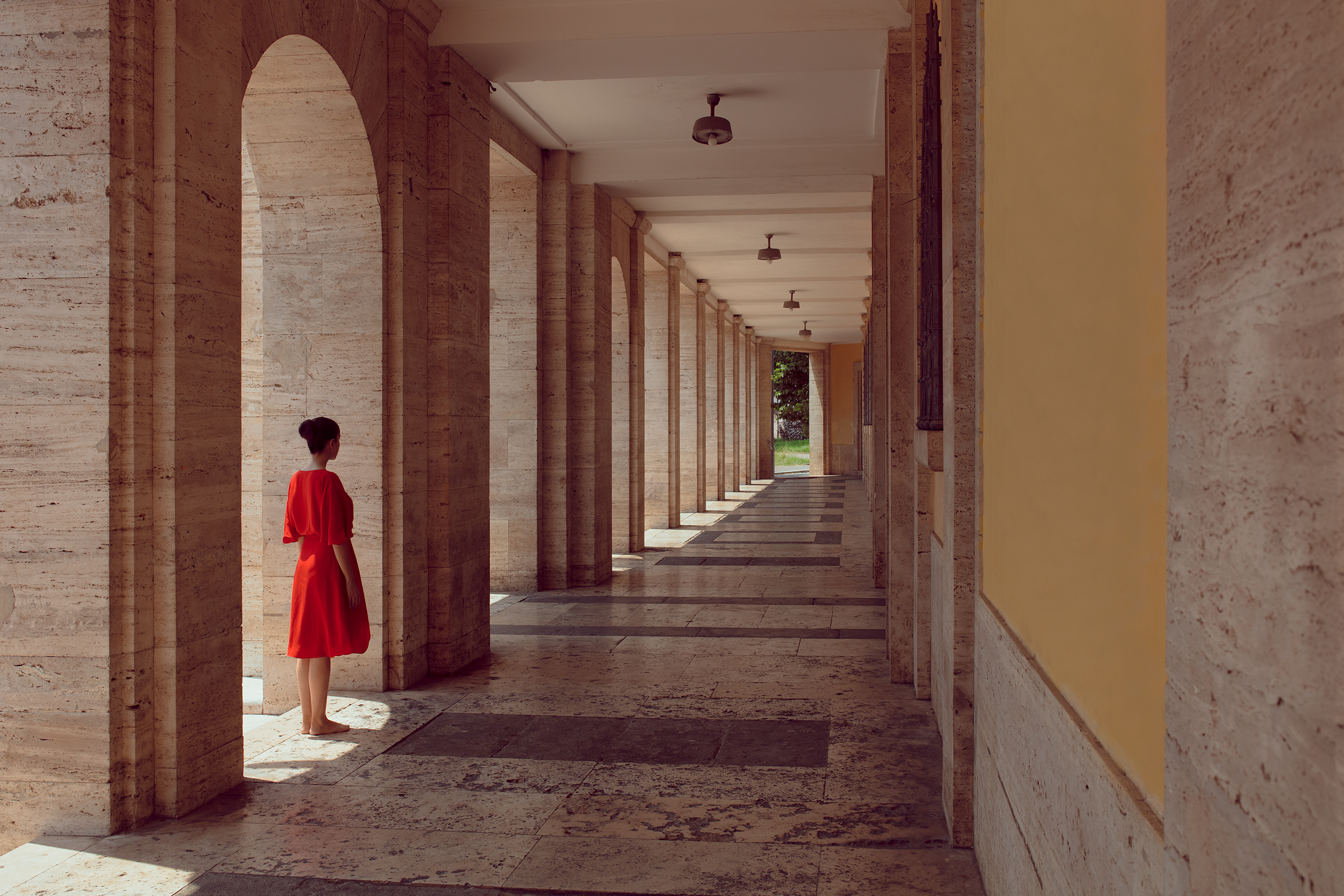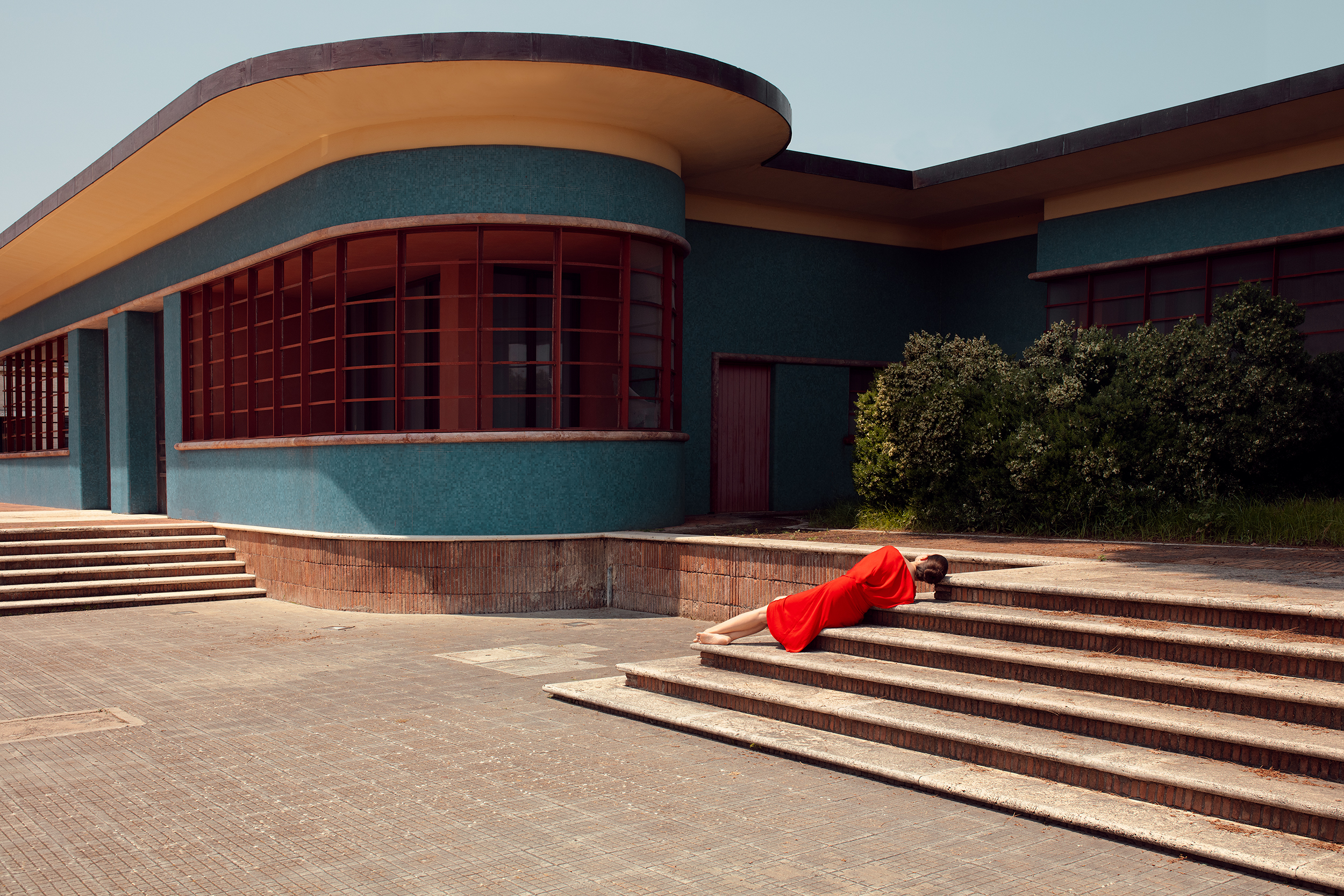La serie fotografica "Lo spazio metafisico" è un’esplorazione intima e personale dell’interazione tra l’artista e l’architettura razionalista italiana degli anni Venti e Trenta del XX secolo. La sua ricerca sulle architetture razionaliste laziali ha radici nel suo territorio d’origine, essendo nata a cresciuta in una città di fondazione, Latina; i suoi autoritratti con il vestito rosso che l’hanno resa nota interpretano lo spirito metafisico delle architetture che ritrae come fossero piccoli atti performativi.