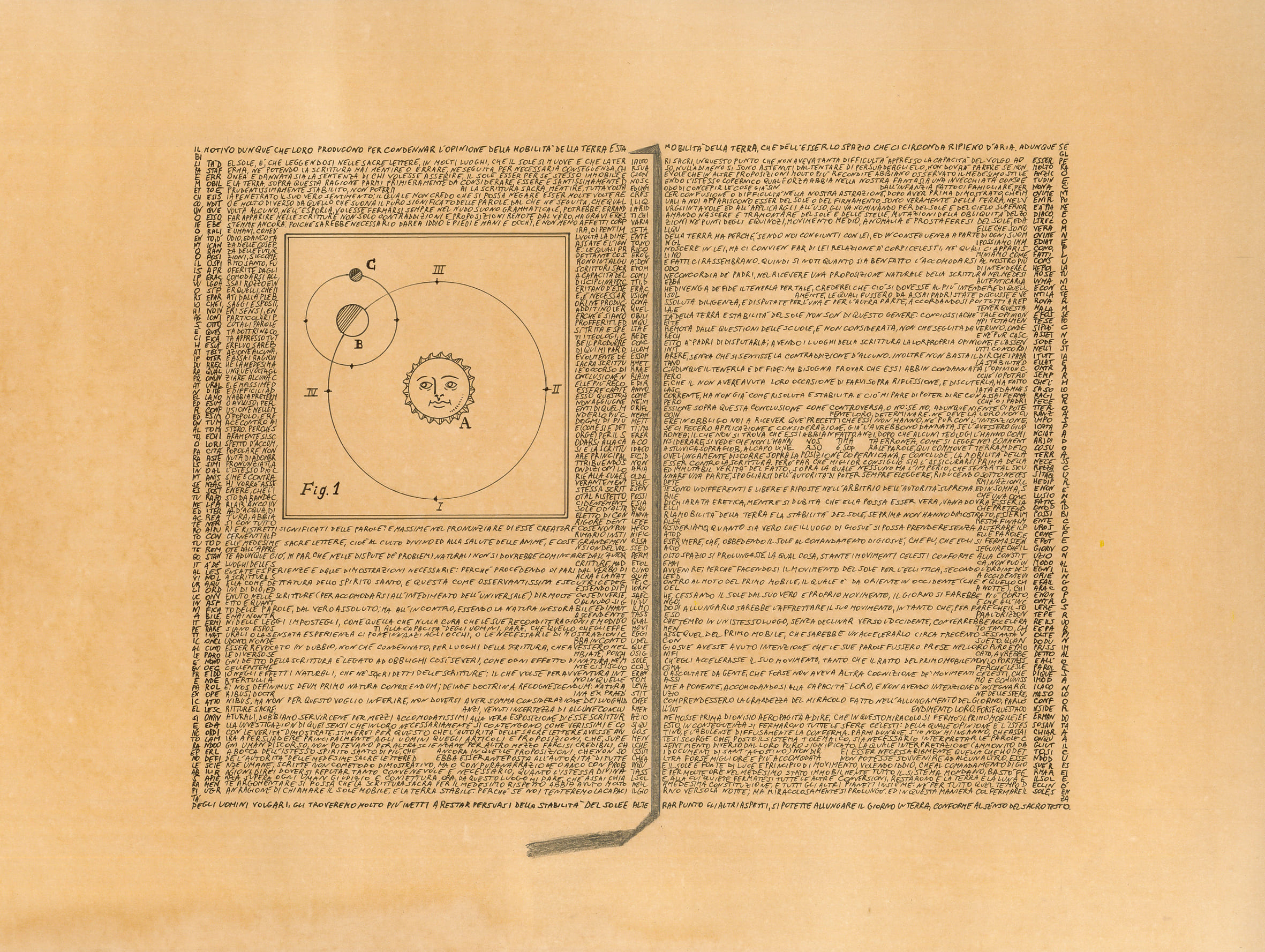 Marcello Carrà Libro inverso Penna e matita su carta incollata su legno 30x40 cm – 2024 Testo di Galileo sul sistema Copernicano