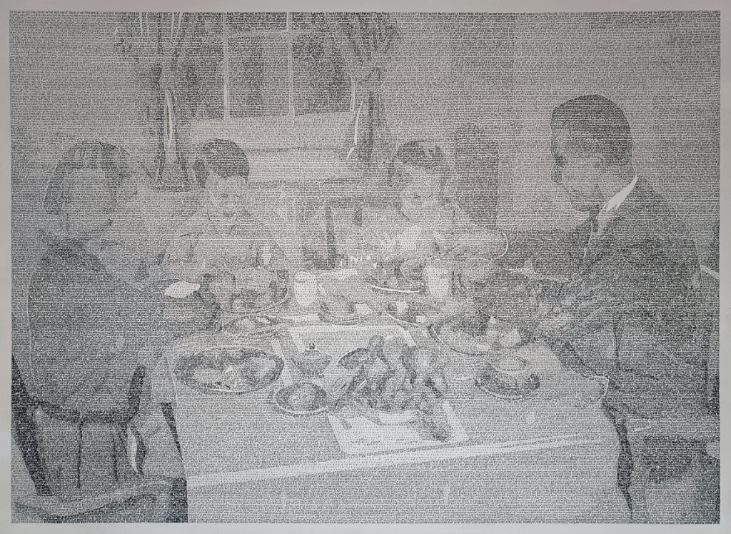 Stupefacente è la trascrizione di A sangue freddo di Truman Capote, true crime in cui Carrà, sempre avvalendosi del concetto di antitesi, rappresenta una felice famiglia americana a tavola: in questo caso l’artista ha delineato le sagome dei protagonisti del romanzo, riuniti attorno alla tavola, attraverso le parole stesse del libro, modificando lo spessore dei pennini a seconda dell’intensità chiaroscurale delle campiture.