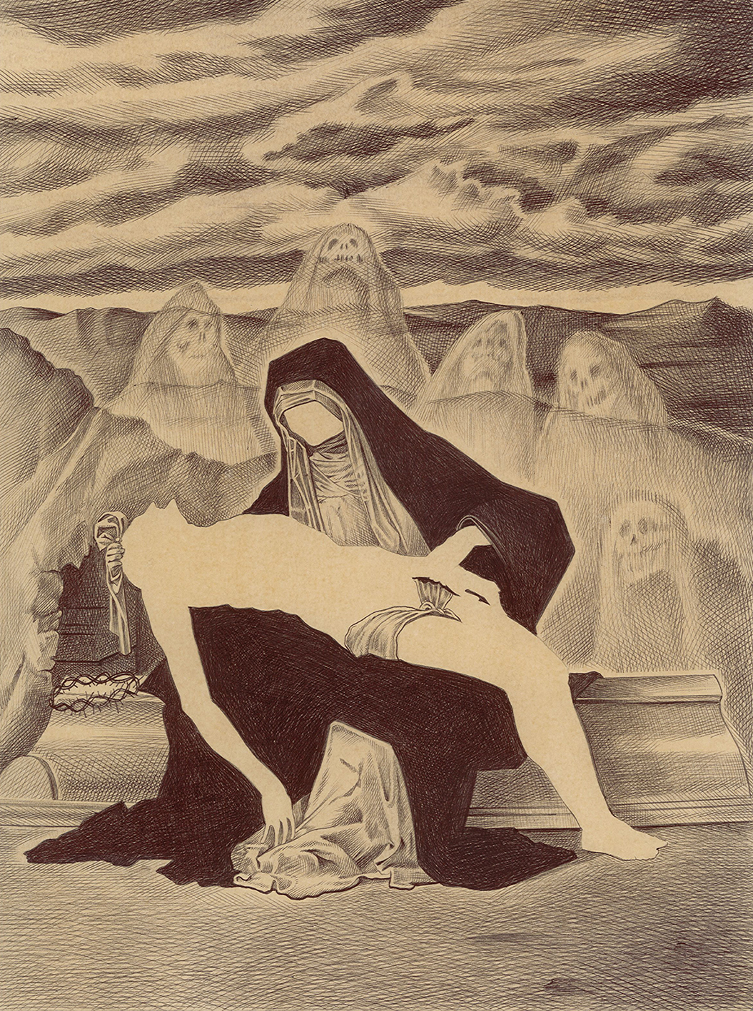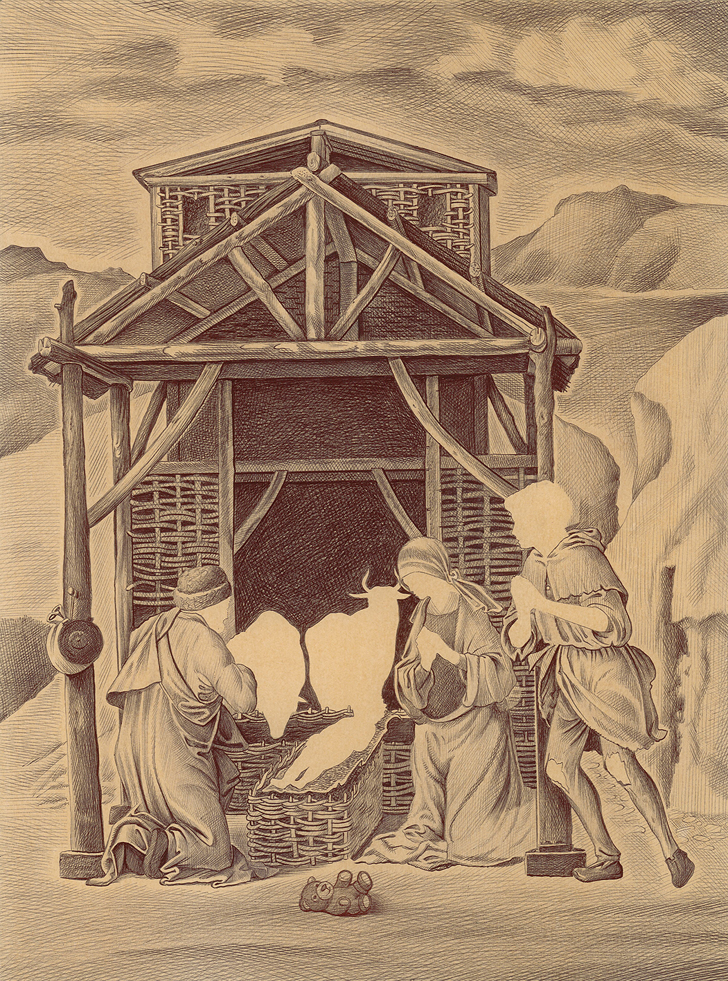 Trittico sulla perdita di spiritualità Natività, Pietà, Resurrezione Penna biro su carta applicata su legno n. 3 pannelli 40x30 cm