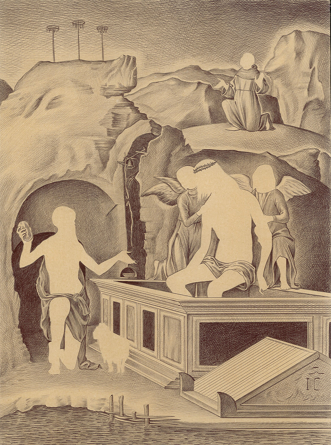 L'altare dell'amore gioioso Marte e Venere Penna su carta applicata su legno 30x40 cm