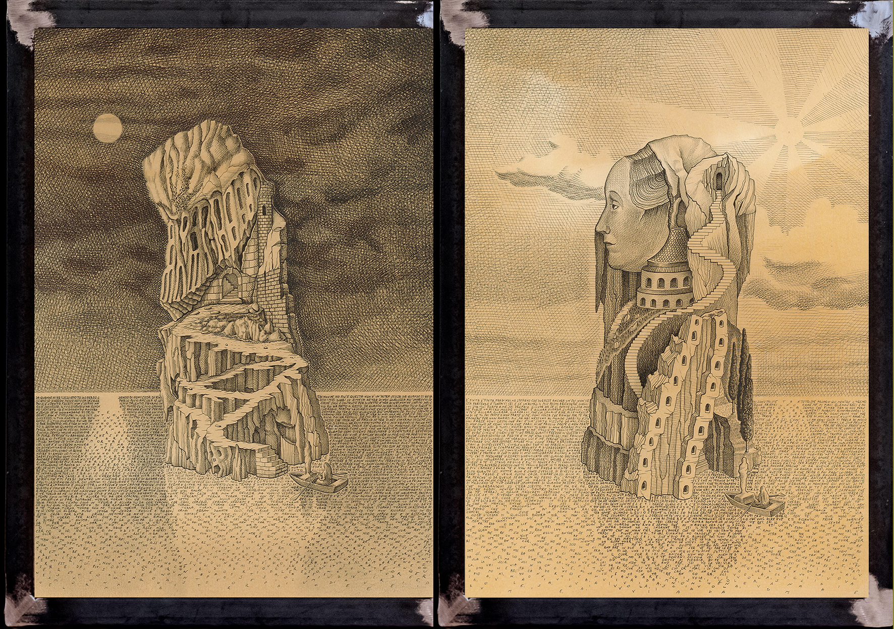 Dittico dell’amore disilluso Giovanni e Ginevra Penna biro su carta applicata su legno n. 2 pannelli 40x30 cm