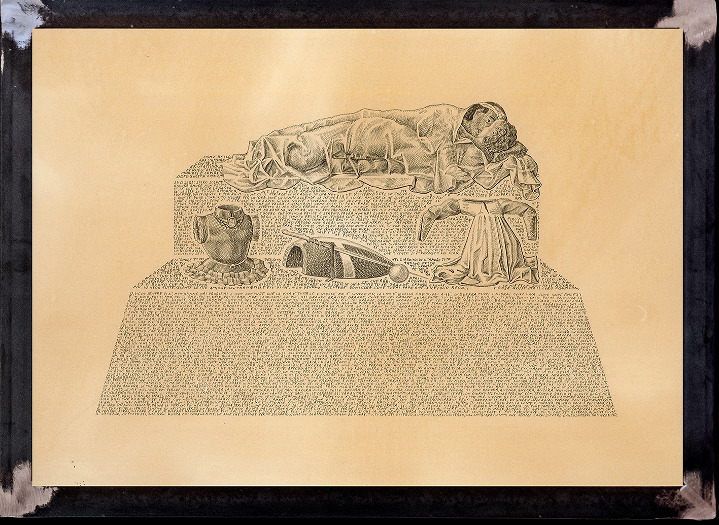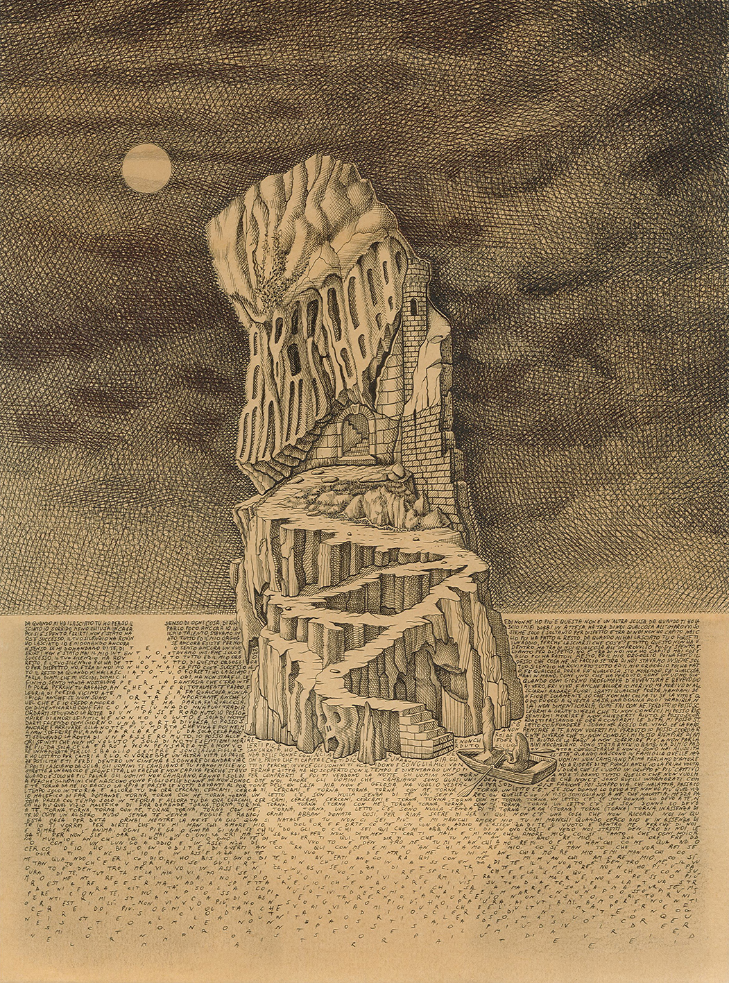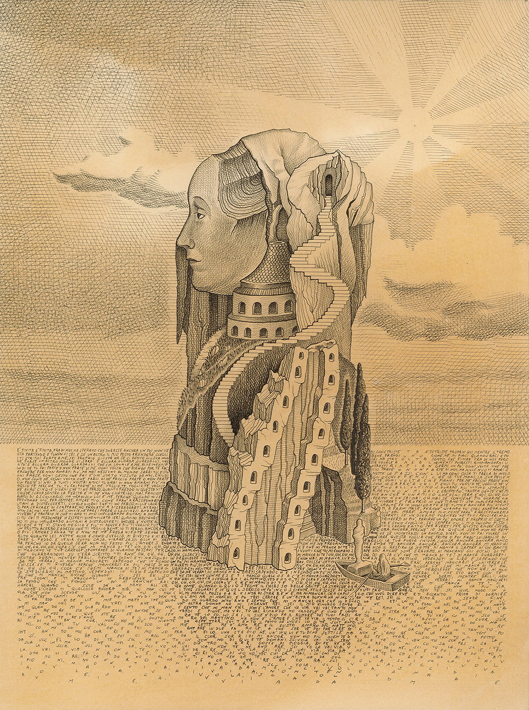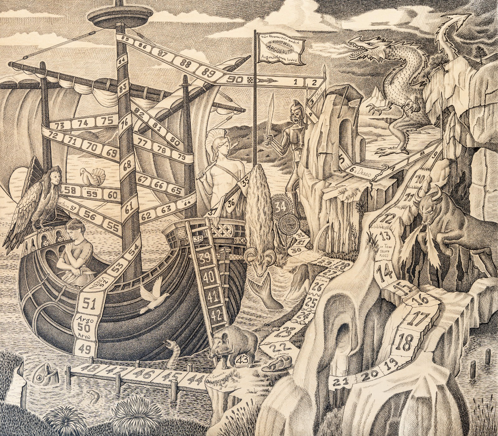 Il gioco degli Argonauti Alla conquista del Vello d’oro Penne a inchiostro e china su carta applicata su legno 61x69 cm