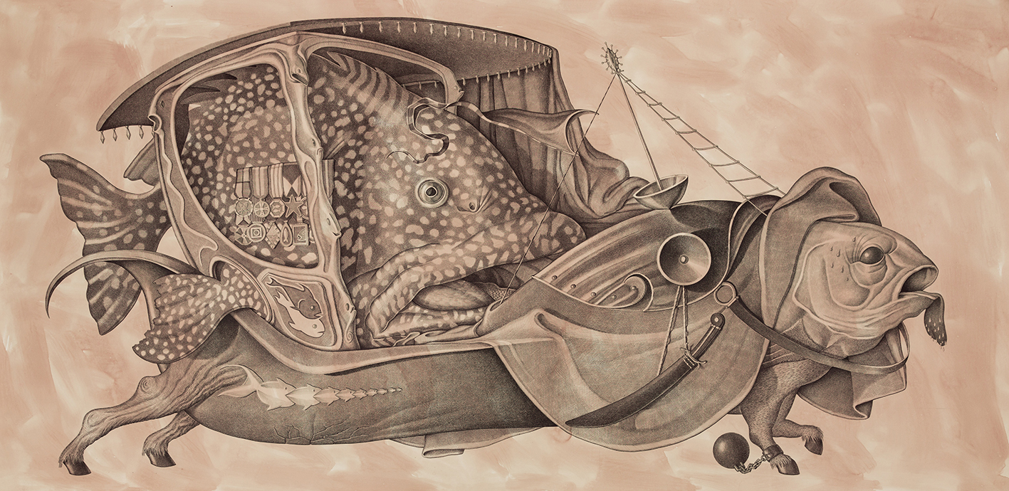 Il pesce grande e il pesce piccolo Allegoria del baronismo Penne a inchiostro e china su carta 150x300 cm