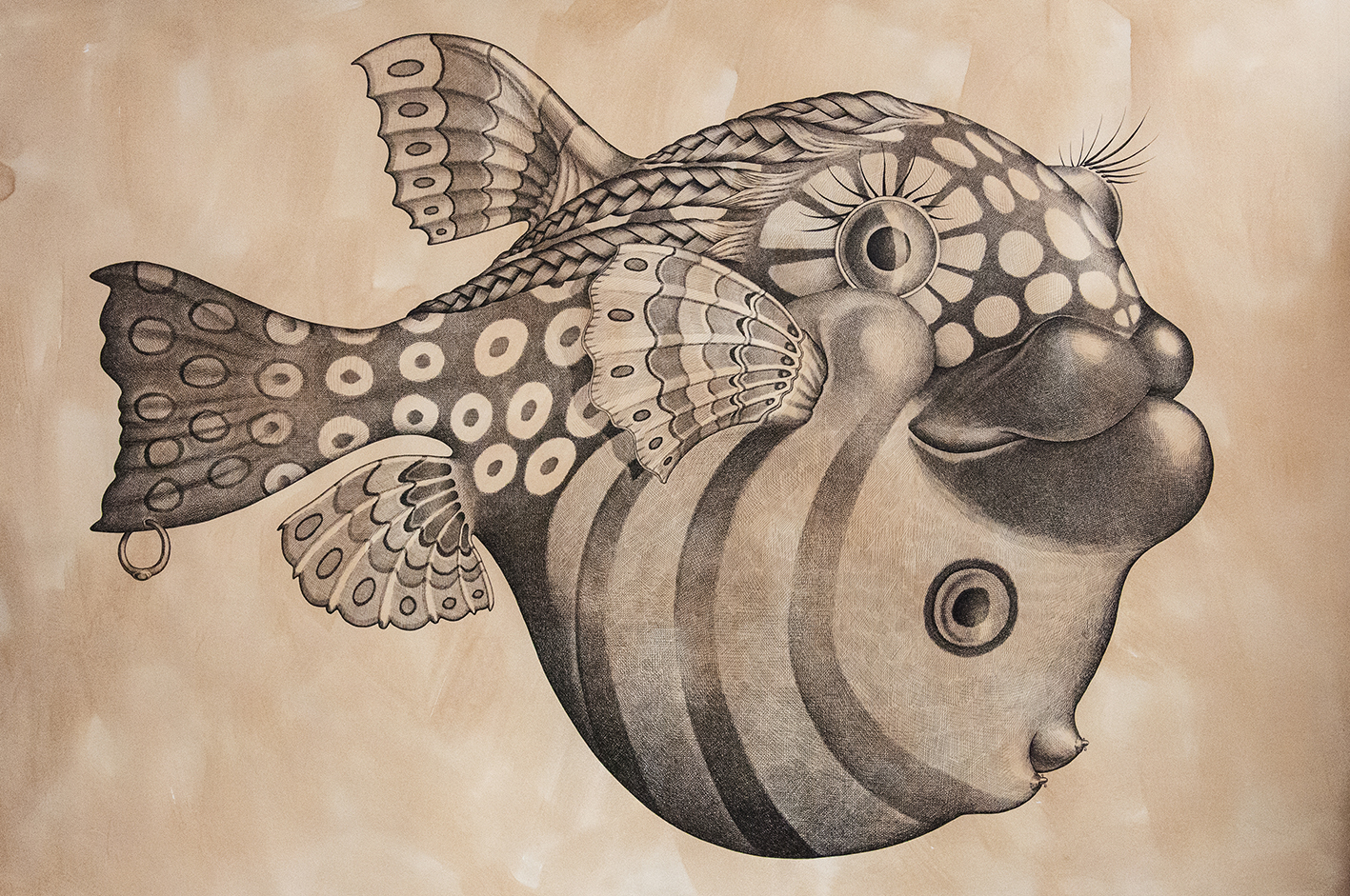 Il pesce palla Allegoria della doppiezza Penne a inchiostro e china su carta 150x200 cm