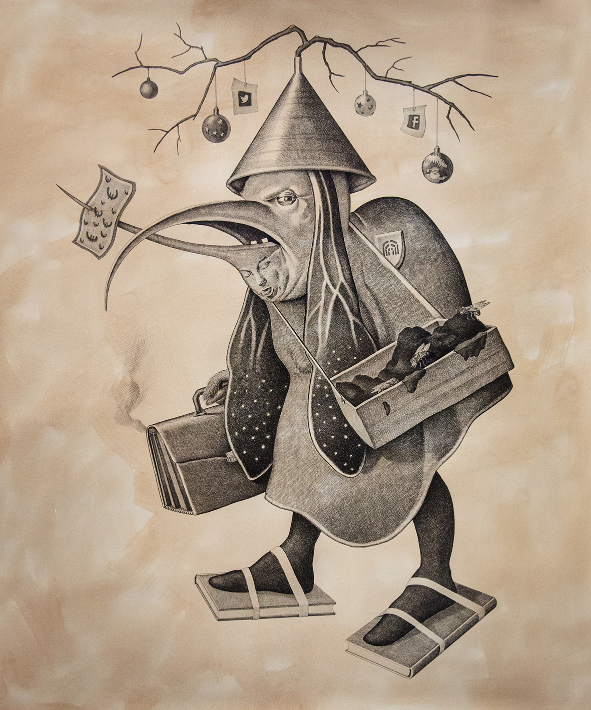 Il venditore di escrementi Allegoria della malapolitica Penne a inchiostro e china su carta 170x150 cm