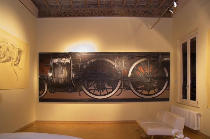 Merlanti lavora sull'idea di archeologia industriale: è rimasto colpito dal fascino di una vecchia locomotiva su un binario morto della stazione di Bologna e ha deciso di dipingerla in scala uno a uno per omaggiare l'operosità di chi l'ha costruita dal vero.