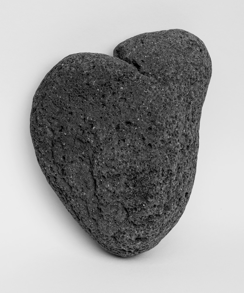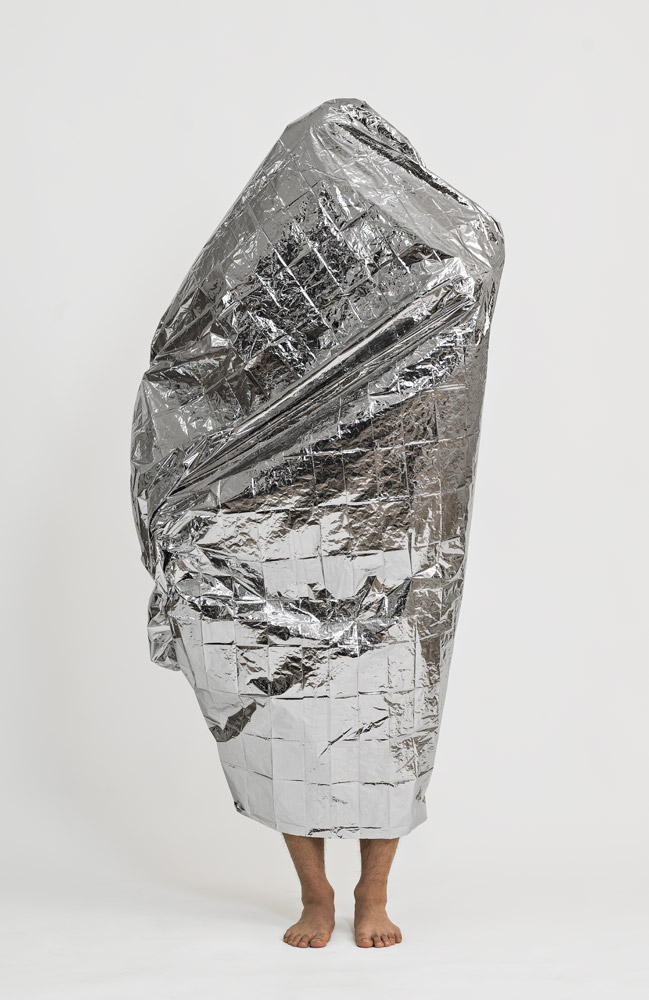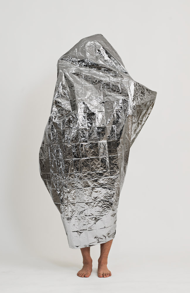 Alle immagini delle figure avvolte nelle coperte termiche (Icona, 2016), utilizzate nel salvataggio dei naufraghi, l’artista attribuisce la plasticità della scultura. Non è una semplice e pura ricerca di forma, ma un trasferimento di senso, uno spostamento, una traslazione, al di là del momento della rappresentazione. Sono umani senza volto perché hanno perso la loro identità, così come ogni altro bene materiale: sono le icone essenziali di un “approdo”. In questo senso anche l’astratta interpretazione delle coperte termiche. (Black silver, 2016) diventa simbolo di accoglienza e di tenera protezione. Mentre l’inesauribile capacità di trasformazione del fuoco diventa, in “Incandescenze #02”, un cuore nero di pietra lavica, simbolo di un luogo, Lampedusa e di una voluta capacità di accoglienza.